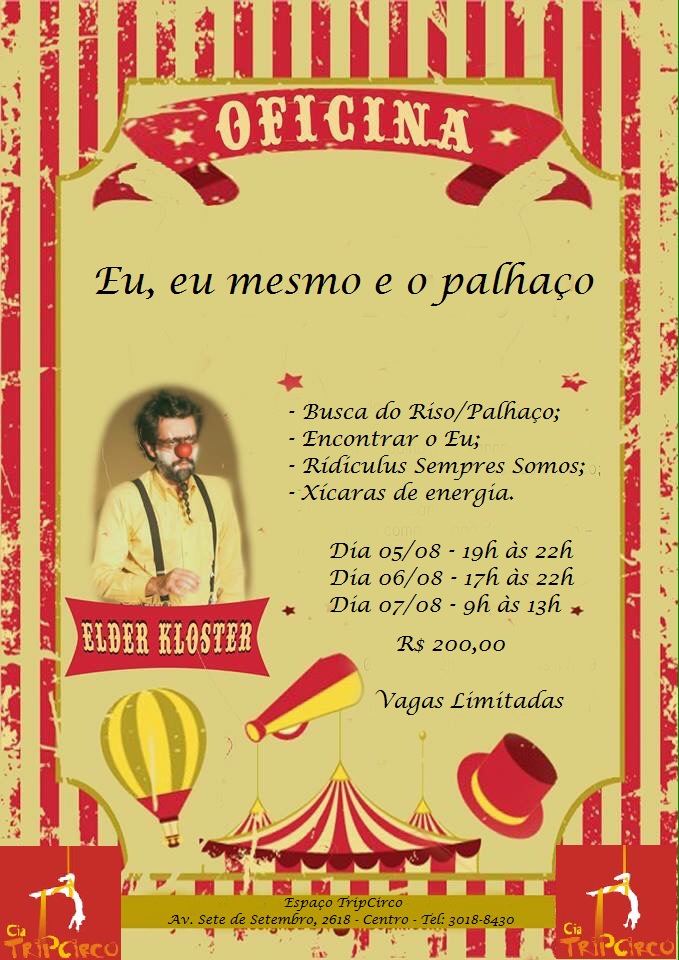 agosto 3, 2016Oficina de Clown – Eu, eu mesmo e o palhaçoOficina Eu, Eu Mesmo e o Palhaço Busca do riso Encontrar o eu Ridículos sempre somos Xícaras de energia Investimento: R$ 200,00 Datas: 05/08 das 19 […]